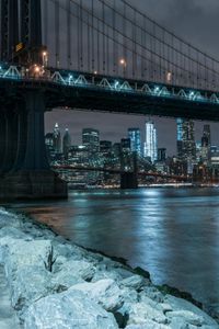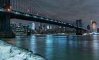 A view of Manhattan at night, illuminated by artificial light and featuring a bridge and underpass. USA, New York City, Urban Cityscape, Skyline.