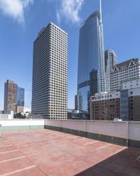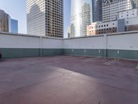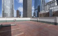 A view of a downtown neighborhood, featuring a mix of concrete and brickwork structures, roads, parking decks, and a stadium in the backdrop. The clear sky reveals the bustling metropolitan area, surrounded by high-rise buildings and skyscrapers.