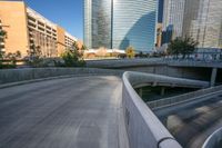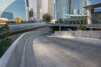 A futuristic urban cityscape with office buildings, a bridge, and a road underpass in Los Vegas, USA. The clear sky and hard shadows create a modern and architectural atmosphere.