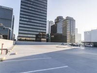 A metropolitan area of concrete and asphalt, featuring a mix of high-rises and skyscrapers, condominiums and parking garages in the downtown district with a clear sky and the sun visible.