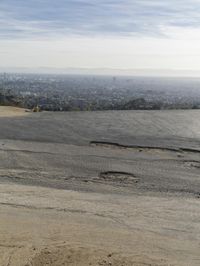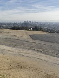 A view of the cityscape from the beach, with a gravel shore, open plain, and tree-topped hill overlooking the sea. A cloud-painted horizon stretches out beyond the ocean, with a few contrails visible in the day sky.