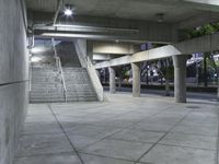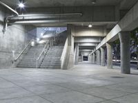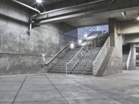 The modern architecture of a metropolitan area stands in stark contrast to the dark, monochrome concrete and metal of a city street. The open space, staircases, handrails, and paver tiles of the parking lot offer a glimpse of the bustling business district beyond.