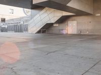 The modern architecture of the city provides an open space at dawn, with concrete, asphalt, cement, wood, flooring, tile, and infrastructure visible in the road surface and subway. The sun shines through the urban ceiling, creating a bright and inviting atmosphere.