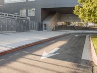 The morning light casts hard shadows on the modern architecture of a residential area. The urban landscape is filled with concrete, asphalt, and other infrastructure such as roads, walkways, and curbs.