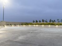A view of an urban landscape at dawn, featuring a mix of concrete, asphalt, water resources, trees, and rooftops, illuminated by artificial light and the morning sky.