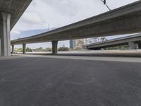 A concrete bridge underpass in Los Angeles, California, USA, illuminated at dawn. The infrastructure of the city is visible, with concrete, asphalt, and a parking lot, as well as a fixed link and hard shadows on the road surface. Automobiles are seen traveling down the lane, while above, clouds form an abstract backdrop in the open space.