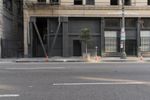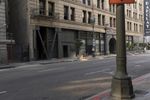 A panoramic view of the architecture, infrastructure, and public space of the city of Los Angeles, California, USA at dawn, with vehicles on the road and in a parking lot, and buildings featuring windows and facades in the background.
