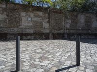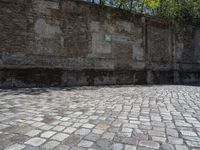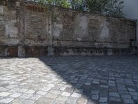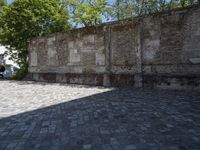 A view of a historic Hinterhof in Berlin, Germany, featuring brickwork, stone walls, cobble stone flooring, and vegetation. The ancient architecture is a reminder of the city's rich history.