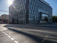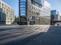 A sunny day in Germany's capital reveals the modern architecture of the city's bustling business district, with an open space, road reflections, and a stoplight visible straight down the road.