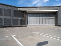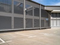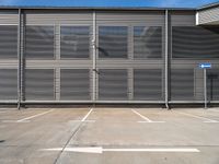 A view of a concrete street, metal wall, and parking garage in Berlin, Germany creates an urban design landscape with a parking deck in the background.