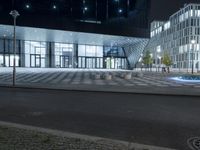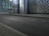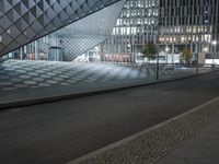 A snapshot of a mixed-use property in the business district of Berlin, Germany with a futuristic architecture of glass, metal, concrete, and steel. Impressively elevated buildings, a crosswalk, and a bridge over a waterway are illuminated by artificial light, casting a dark monochrome shade and shadow on the open space, road surface, and cobble stone below.