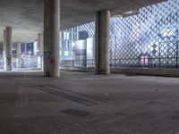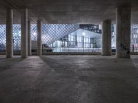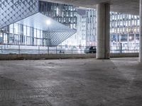 A night view of a modern architecture building in Berlin, Germany, featuring a concrete bridge, a steel frame, a glass window, a dark city life, and an open room with artificial lighting from the parking deck.