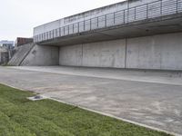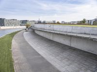 A composite view of Berlin, Germany's modern architecture, infrastructure, and urban design. A concrete bridge spans a river, leading to a metropolitan area full of buildings, cityscapes, and a clear blue sky above. The open space is filled with vegetation such as grass and trees, and the sun casts its rays on the road surface below.