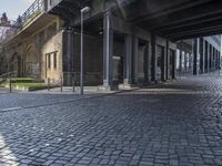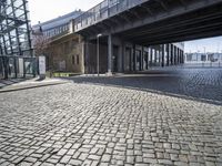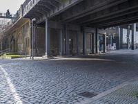 A view of Berlin's urban design, featuring a bridge, road, underpass, cobblestone road surface, shadow and reflection, and a tree in the foreground. This bustling European city offers a unique blend of architecture, city life, and art district vibes.