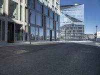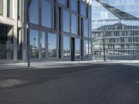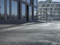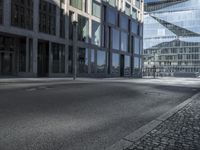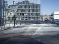 A snapshot of the metropolitan area of Berlin, Germany, featuring modern architecture, mixed-use infrastructure, residential and business properties, and public space. The monochrome facade of the high-rise building is illuminated by the light of day, and its glass walls are reflected in the asphalt road surface with hard shadows cast from the trees and other structures nearby.