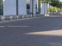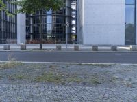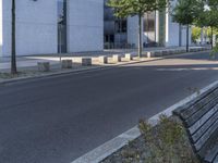 The modern architecture of a business district in Berlin, Germany, is illuminated by the warm sunlight of a summer day. The asphalt roads, public benches, and outdoor furniture of the neighborhood are highlighted against a backdrop of high-rise condominiums, office buildings, and trees. The urban design showcases a variety of materials, including grey composite, wood, and tar, and creates a unique atmosphere for the city.