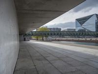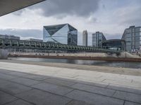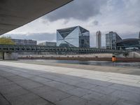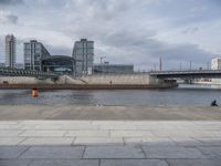 The modern architecture of Berlin, Germany, is highlighted in this composite cityscape. Featuring a concrete bridge, metropolitan skyline, grassy public spaces, and a waterfront jetty, this scene illustrates the beauty of the city's urban design.