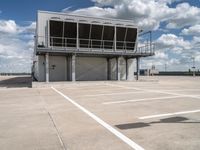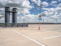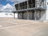A view of modern architecture in the city of Berlin, Germany. The scene includes elements such as the asphalt road, composite material and wood facade of a building, a parking deck, a factory, a field house, concrete street and a gas silo. The clear sky is speckled with cumulus clouds, while a street light illuminates the urban infrastructure.