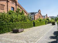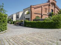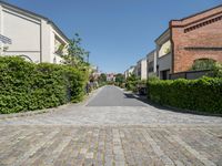A classic architecture view of a residential area in Berlin, Germany. The cityscape with its cobble stone pavement, brickwork, street lights, and house facades creates a beautiful symmetrical view with vegetation along the roadside. The clear sky sets a beautiful backdrop for the city life and infrastructure of this urban biome.