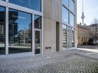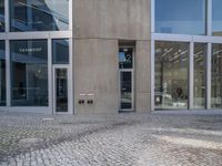 A profile of a modern architecture office building in a residential business district of Berlin, Germany. A clear sky day with a snow-covered cobble stone surface and concrete curb provide a contrast of urban design elements.