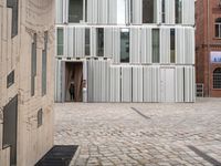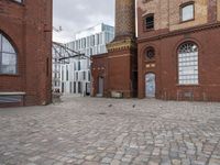 A classic architecture building in Berlin, Germany with an open space courtyard, a warehouse and modern architecture elements, including brickwork, cobble stone roads, wood fixtures and a bicycle with a tire and wheel in the foreground. A sunny day with clouds in the sky, highlighting the tints and shades of the urban design and property of the neighborhood.
