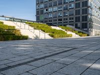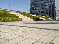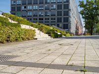 A composite of urban design elements in Berlin, Germany, including buildings, roads, trees, and a stadium, set against a clear azure sky.