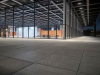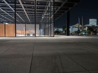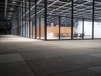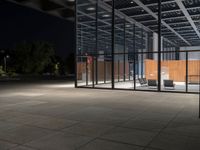 Black-and-white photograph of a mixed-use building in Berlin, Germany. Automotive lighting and materials such as concrete, glass, metal, and wood come together to form a modern architectural facade. The facade is illuminated with artificial light and features a symmetrical composition of windows, columns, and a tree-lined parking lot. The sky is slightly tinted with shades of grey.