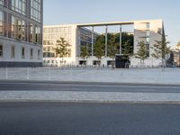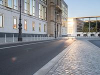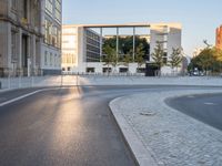 A modern high-rise condominium building stands illuminated against the break of day in Berlin, Germany. The thoroughfare is lined with asphalt and features a variety of urban design elements such as trees, vegetation, public spaces, and roadways. Sunlight reflects off the building facade, casting a warm light on the cityscape below.