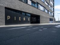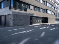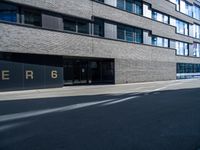 A view of the modern architecture and urban design of Bremen, Germany. The cityscape features a composite material facade of a residential building, a brick wall, a hotel, a condominium, and an office building, all surrounded by an asphalt road and brick alley-ways. The day's sunlight casts hard shadows on the ground, creating an interesting contrast of tints and shades.