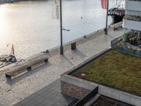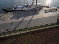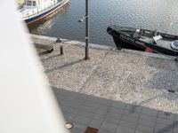 A day in the city of Bremerhafen, Germany. The landscape consists of an elevated roadway with a combination of asphalt, cobblestone, and concrete flooring. The harbor is lined with boats and naval ships of various sizes, from small vessels to large warships. The foreground includes a paver, a streetlight, and a tire, while the background features modern architecture, vegetation, and a lake.