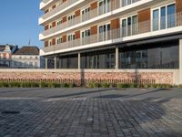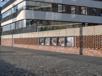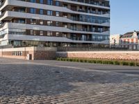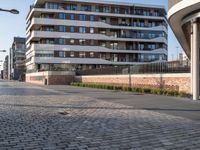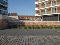 A view of a modern urban residential area in Bremerhafen, Germany, featuring a mix of cobblestone roads, brick walls, asphalt, wood, and vegetation. The clear sky backdrop and street lights provide a beautiful contrast to the cityscape, with its high-rise condominiums, office buildings, and other landmarks, as well as the pier, jetty, and boats in the harbor. This is a perfect example of modern European architecture and urban design.