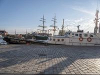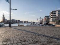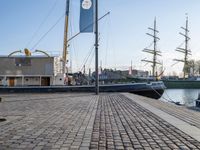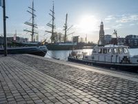 A tall ship is seen moored in Bremerhafen Harbor, Germany, with a clear sky and sunny day. The city skyline is visible in the background, with cobblestone roads and modern residential architecture. A bridge, tree, and street light are seen in the foreground, along with a jetty, pier, and lake. The urban design and infrastructure provide a transport hub for the naval architecture and vehicles in the harbor.