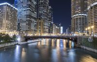A nighttime view of the city of Chicago, USA featuring a modern architecture bridge, high-rise buildings, a river, and a skyline of buildings illuminated by artificial light. This metropolitan area serves as a hub of commerce and recreational open space, creating a unique urban design experience.