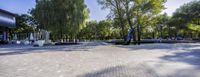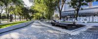 A panoramic view of a beautifully designed public space in China, showcasing modern architecture and lush vegetation under a clear sky.