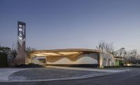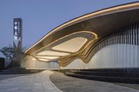 A stunning view of a residential building with a beautiful facade, surrounded by trees and vegetation in Chongqing, China. The clear sky reflects on the surface of the nearby lake, creating a mesmerizing reflection. This architectural masterpiece is a true tourist attraction and an example of modern urban design in the bustling metropolitan area of Chongqing.