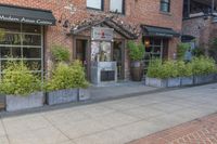 A low brick building with a wooden door and window, surrounded by public spaces, roads, pavement, and vegetation, all part of the city's urban design infrastructure in a residential area.