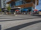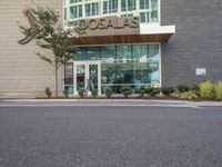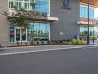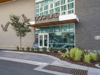 A view of a modern office building with a stylish facade, surrounded by lush vegetation and trees in a bustling city.