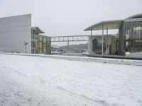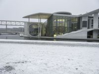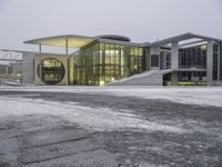A composite material building with a facade of asphalt, door, window, house, office building, road surface, shade, vegetation and water in a city during winter.