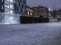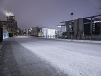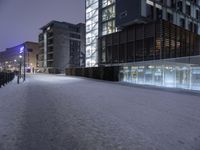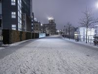 A view of a city's downtown area with a soaring high-rise condominium, lit up by street light, in the foreground. The road surface is covered in asphalt, and the atmosphere is filled with tints and shades of sunlight, trees, and vegetation. The frozen morning sky is filled with clouds.