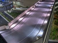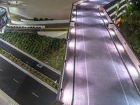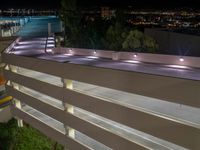 A top down view of a residential parking deck in Los Angeles, USA, illuminated by artificial light and street lamps. The curved driveway and one quarter angle of the asphalt gives an interesting perspective of the urban design.
