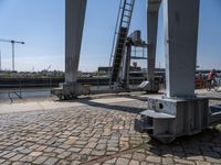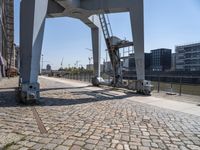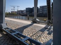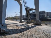 The modern architecture of a residential area in Hamburg, Germany is illuminated by a street light as a jetty pier and factory bridge provide a glimpse into the urban life of Deutschland. The composite material of cobble stone, asphalt, wood, metal, concrete, and water surface provide the infrastructure, while curbs, bench, road, tree line, and vegetation provide a public space. The dawn light highlights the roof, condominium, beam, curb, engineering, flooring, and facade of a high-rise building.