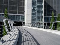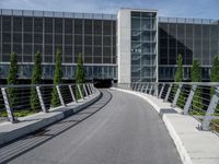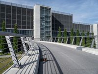 An aerial view of a metropolitan city in Germany, featuring modern architecture, roads, bridges, parking garages, vegetation, high-rises, office buildings, and other infrastructure. The symmetrical urban design is highlighted by the grey asphalt and composite material roads, curbs, and parking decks, contrasting with the green vegetation and clear sky overhead.