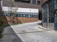 A view of the classic architecture of a European city, featuring a cobble stone road, asphalt driveway, brick wall, concrete curb, brickwork, and vegetation. The alley-way showcases a parking garage, warehouse, and a public space filled with wood fixtures, tar flooring, grey manhole covers, and a storm drain. The facade is adorned with windows, providing shade on a sunny day.