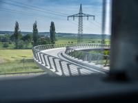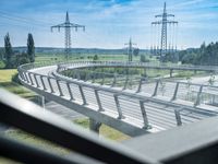 A modern skyline of a metropolitan area in Europe, featuring an elevated roadway, a transmission tower, and a variety of infrastructure, vegetation, and architecture, including a parking deck, a condominium, a bridge, and an office building.