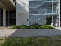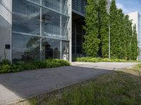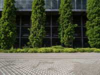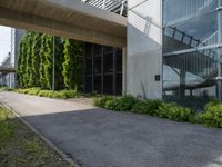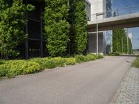 A modern city neighbourhood featuring a combination of residential areas, parking decks, office buildings, public spaces, and evergreen vegetation in the European country of Germany. The composite material of asphalt, wood, and grey tar create a thoroughfare beneath a clear sky with a hard shadow cast on the groundcover.
