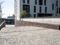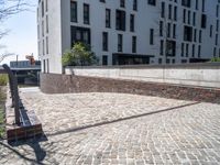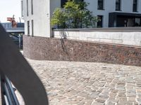 The modern architecture of a residential area in Hamburg, Germany is highlighted in this image. A cobble stone road with straight lines and brickwork leads down the alley-way to a brick wall facade. Trees and other vegetation line the curb and provide a beautiful contrast to the asphalt and composite material flooring of the public space.