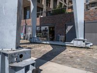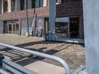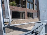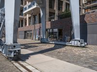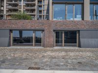 A view of the urban design elements of Hamburg, Germany, with a modern high-rise condominium in the foreground, a cobble stone road leading to a harbor in the background, and a cafe in the clear sky. Facades of buildings, asphalt road surfaces, and vegetation provide shade to the urban area.