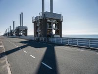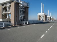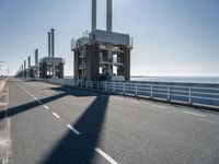 A modern urban landscape in Holland, with a coastal waterfront, high-rise buildings, a road surface of asphalt and tar, and a variety of urban structures like fences, windmills, and bridges visible in the clear sunny skies above.
