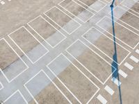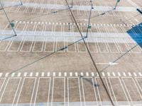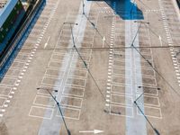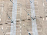Aerial view of a modern parking garage in the Netherlands, Europe, featuring asphalt roads, composite material floors, grey concrete streets, wood roofs, beige facades, and electricity infrastructure. The parking lot offers plenty of open space and public areas with parallel rectangles of light, flooring, materials, and products.