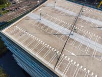 An aerial view of the modern architecture and infrastructure of Holland, featuring parking lots, parking decks, parking garages, a road, open space, concrete streets, grilles, buildings, vegetation, a stadium, street lights, a residential area, a land lot, a transport hub, a facade, and a high-rise, with patterns of rectangles, composite materials, wood flooring, metal mesh, asphalt, concrete, a slope, electricity, gas, grass, trees, windows, solar energy, lines, symmetry, circles, tracks, and engineering.